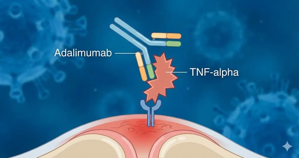 با این اتصال، آدالیمومب مانع از نشستن TNF-alpha بر روی گیرندههای مخصوصش میشود. در نتیجه، پروسههای التهابی وابسته به سایتوکاینها مهار میشوند. افزایش سطح TNF در مایع مفصلی (سینوویال)، عامل اصلی درد پاتولوژیک و آسیب ساختاری در بیماریهایی مانند آرتریت است که این دارو آن را کنترل میکند.